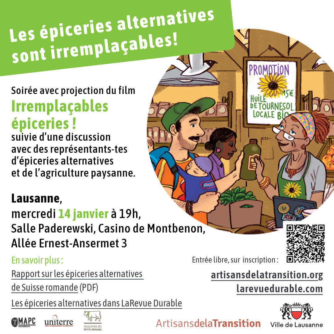 Suivie d’une discussion avec notamment Natacha Litzistorf (Ville de Lausanne), Sophie Rothrock (Coupe-Circuit), Carole Richardet (C’est Patou et Association des épiceries alternatives romandes) et Berthe Darras (Uniterre)