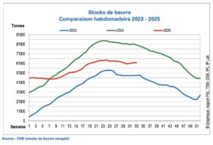 Autre élément perturbant : la Suisse a à nouveau vécu en 2024 avec sa « montagne de beurre » : 8’000 tonnes de stock de beurre à fin juin 2024, après avoir connu d’exceptionnelles pénuries de beurre de 2020 à 2023. Du coup, décision 2024 : il faut exporter 2’000 tonnes de crème et 680 tonnes de beurre. Mais à fin juin 2025, nous sommes à 6’263 tonnes de beurre, et là, l’Interprofession Lait nous annonce qu’il faut exporter 2 000 tonnes de crème et 2 000 tonnes de beurre.