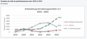 Enfin, autre aberration du système : il y a aussi plus de beurre et de poudre sur le marché suisse car l’agro-industrie importe de plus en plus cette matière première, soit-disant « moins cher » pour la réexporter : c’est le trafic de perfectionnement, notamment à cause de la flambée du prix du cacao en 2024. Un chiffre : l’importation de poudre de lait est passée de 1’000 tonnes en 2019 à quasi 5’000 tonnes en 2024.
