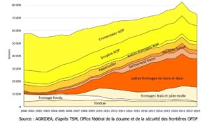 La part des fromages importés est ainsi passée de 20 % en 2000 à 37 % en 2023, avec une prédominance des fromages frais et à pâte molle, qui représentent 61 % du total des importations5.
