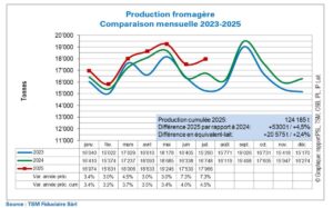 De même si l’on regarde les schémas suivants 4 et 5 de production et d’exportation de fromages de 2023 à 2025, on constate qu’entre janvier et juillet 2025, la production de fromage a augmenté sur chaque mois comparé à 2024 et que les exportations de fromages ont également augmenté sur janvier, février, mars, mai et juillet 2025 par rapport au mêmes mois 2024, avec une forte augmentation de 14,8% en juillet 2025, et qu’elles ont certes diminué les mois de février et avril mais très faiblement (-1,1% et -1,9%).