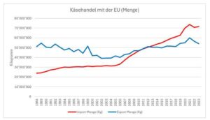 Autre point important à soulever. Pour la première fois, la Suisse a enregistré en 2023 un solde négatif dans le commerce du fromage : les volumes des fromages importés ont dépassé les volumes exportés (schéma 7).