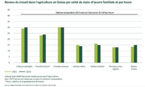 Les producteur·trices de lait touchent en moyenne 15 francs de l’heure pour 66 heures de travail par semaine13 (chiffres 2023 – schéma 9), alors qu’un salaire comparable s’élève à 42 francs de l’heure pour 42 heures hebdomadaires. Comment peut-on tolérer une telle inégalité ? C’est une forme d’esclavage moderne, visible sous nos yeux, au cœur même de nos campagnes.